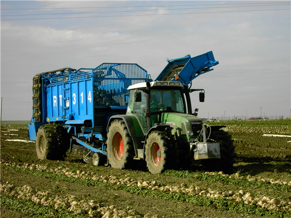 西班牙馬賽甜菜揀拾裝車機(jī)是在甜菜挖掘機(jī)將甜菜集成一條以后作業(yè)的。它可將集成一條的甜菜揀拾起來(lái),在通過(guò)后面的三個(gè)星狀清潔輪將甜菜清潔干凈,然后再將甜菜通過(guò)提升機(jī)輸送到料斗里。料斗有7噸、10噸和14噸的。然后再通過(guò)料斗底部和側(cè)面的輸送帶將甜菜卸到運(yùn)輸車上。